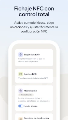 Az alkalmazással teljes mértékben digitalizálhatja és professzionálissá teheti a munkahelyi jelenlét kezelését. Könnyedén kioszk móddá alakíthat bármilyen eszközt, hozzárendelhet egyedi helyszíneket a terminálokhoz, és központilag kezelheti az NFC kártyákat – legyen szó azok hozzárendeléséről, szerkesztéséről vagy törléséről. A Bizneo HR Fichaje con Kiosco egyszerű, mégis átfogó megoldást kínál, mentesen a technikai komplikációktól és a felesleges hardverberuházásoktól. Felhívjuk figyelmét, hogy a Bizneo HR Fichaje con Kiosco használatához Bizneo HR ügyfélnek kell lennie.