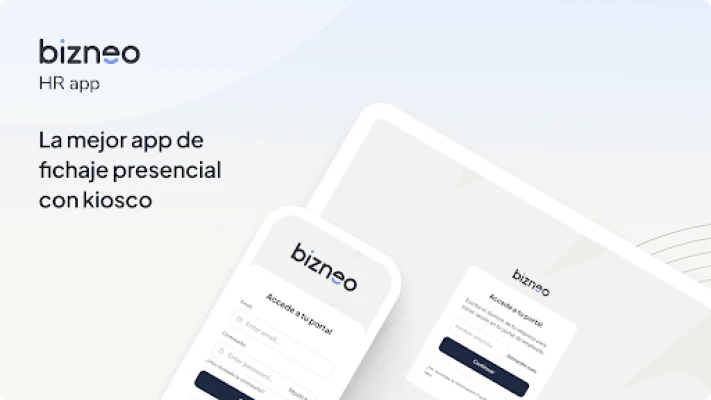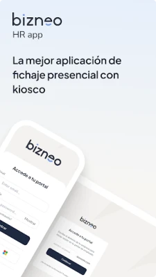 A Bizneo HR Fichaje con Kiosco alkalmazás bármilyen eszközt, például tabletet vagy mobilt, jelenléti munkaidő-nyilvántartó terminállá alakít. Lehetővé teszi az alkalmazottak számára a be- és kilépések rögzítését NFC kártyákkal, PIN kóddal, QR kóddal vagy biometrikus adatokkal. Rugalmas és központosított megoldást kínál hardvervásárlás nélkül.